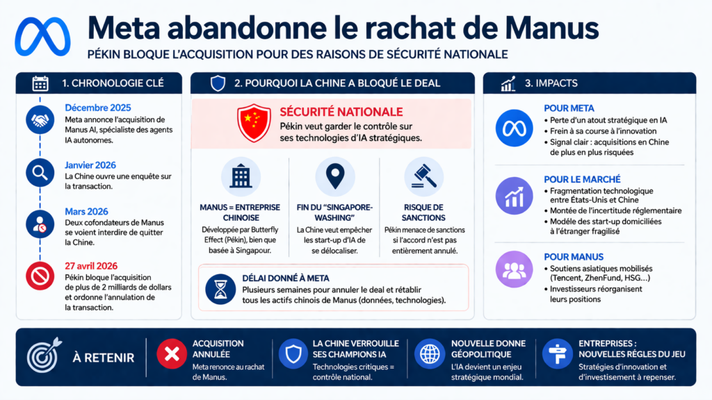 Lundi 27 avril, les autorités chinoises ont officiellement interdit la vente de Manus AI à Meta, valorisée à plus de 2 milliards de dollars. Cette décision fait partie d’une logique désormais bien établie. Celle de protéger les actifs technologiques jugés stratégiques.