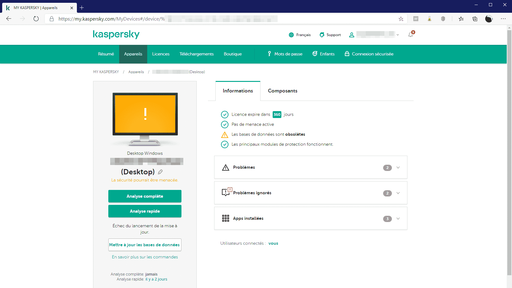 Quel que soit l’appareil utilisé, il est important que celui-ci soit constamment connecté à internet. Non seulement pour l’activation du produit, mais aussi pour les mises à jour et l’accès à certaines fonctionnalités. De plus, la détection hors ligne n’est pas toujours très efficace.