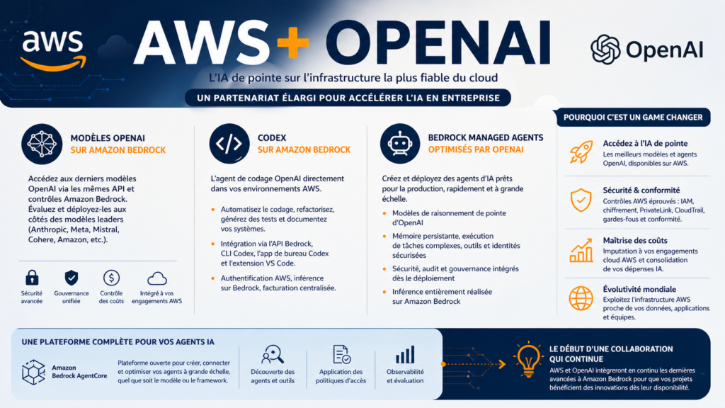 Avec ce partenariat renforcé, AWS ne cherche pas seulement à héberger des modèles. Il veut devenir la plateforme de référence pour déployer des systèmes d’IA complets. En intégrant les modèles OpenAI, en facilitant l’usage de Codex et en industrialisant également les agents, AWS couvre toute la chaîne de valeur, du modèle à l’application métier.