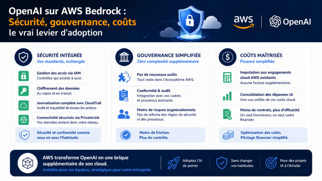 Dans de nombreux projets IA, la difficulté n’est pas technologique, mais organisationnelle. Ajouter un nouveau fournisseur implique souvent de revoir les règles de sécurité, les processus d’audit ou les modèles de facturation. Ici, tout reste intégré dans l’écosystème AWS.