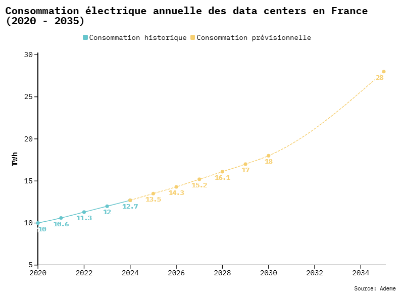 En outre, EDF prévoit de porter sa production à 400 TWh d’ici 2030. Une initiative qui permettra d’absorber largement la hausse de la demande des data centers français, estimée à 18-19 TWh pour la même échéance.