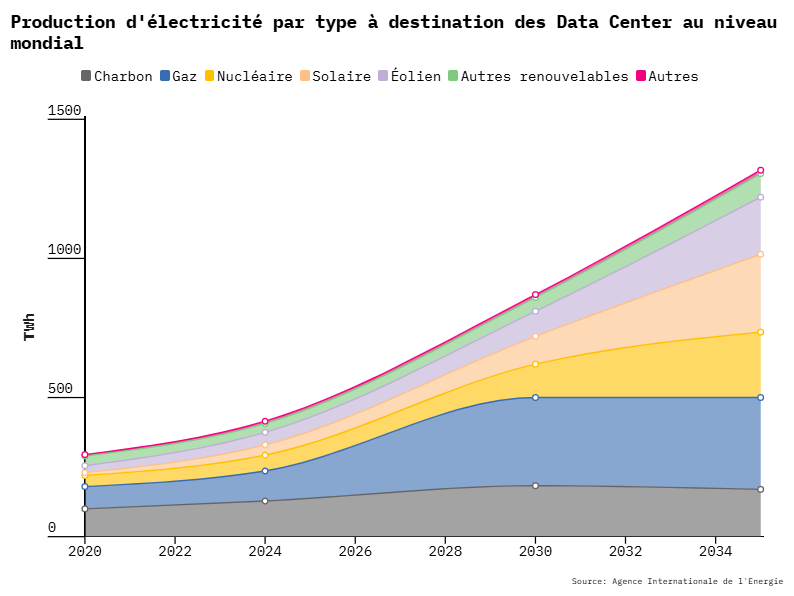 En 2024-2025, les datas centers ont consommé 415 TWh, soit environ 1,5 % de la demande mondiale d’électricité. D’ici 2030, cette consommation devrait doubler pour atteindre 1000 TWh.