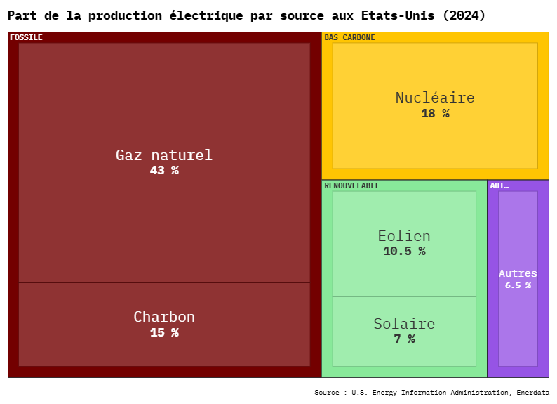 À l’inverse, le mix énergétique mondial reste dominé à 60 % par les énergies fossiles. Aux États-Unis, le gaz naturel et le charbon représentent encore plus de 50 % de la production électrique.