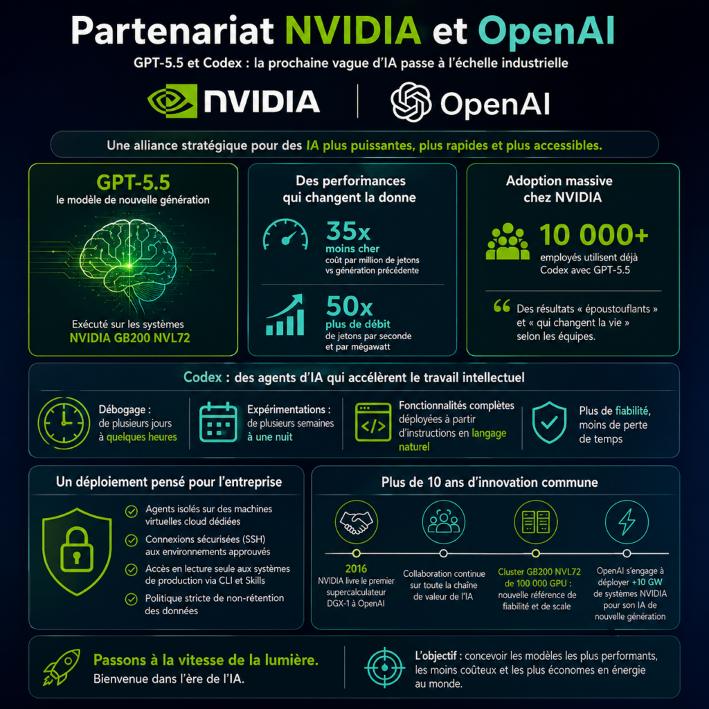 Plus de 10 000 employés de NVIDIA utilisent déjà GPT-5.5 au quotidien. Les gains de performance peuvent atteindre 50 fois en débit et les coûts sont divisés par 35. Avec ce nouveau partenariat entre NVIDIA et OpenAI, l’IA générative entre dans une phase d’industrialisation concrète.