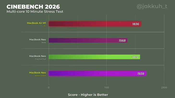 Pour un ultraportable censé rester sage, atteindre jusqu’à 105 °C en pleine charge, c’est un plafond thermique sévère. Le MacBook Neo se retrouve ici propulsé grâce à un mod dont une optimisation thermique simple et intégration d’un watercooling complet. Ce projet montre que la chaleur est un véritable arbitre de la puissance dans les ordinateurs portables modernes.