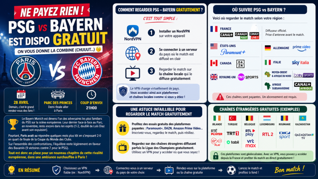 Aux États-Unis, le match PSG vs Bayern sera diffusé sur Paramount+, tandis qu’au Canada, il sera disponible via DAZN. Au Royaume-Uni, les téléspectateurs devront se tourner vers TNT Sports.