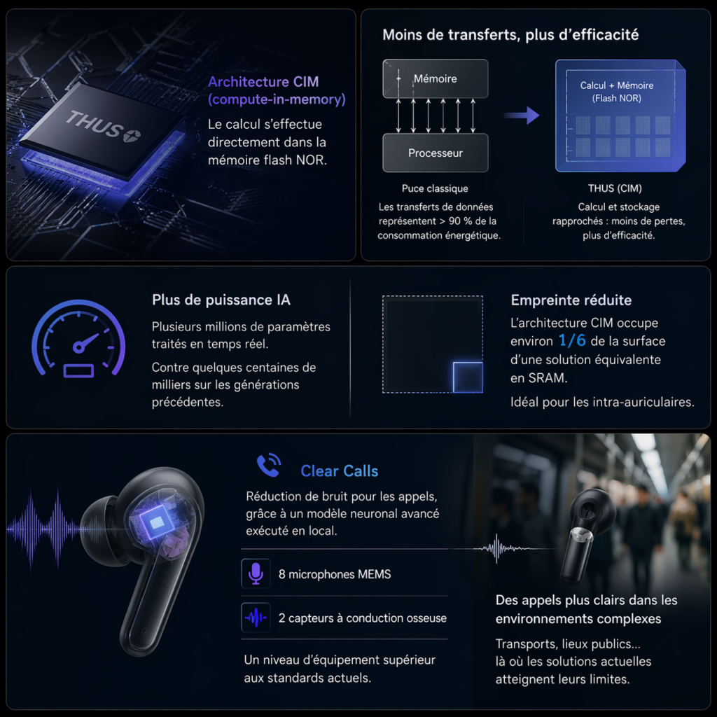 En rapprochant calcul et stockage, Thus réduit cette dépense énergétique et augmente la capacité de traitement. La puce peut ainsi gérer plusieurs millions de paramètres en temps réel. Contre quelques centaines de milliers sur les générations précédentes d’écouteurs.