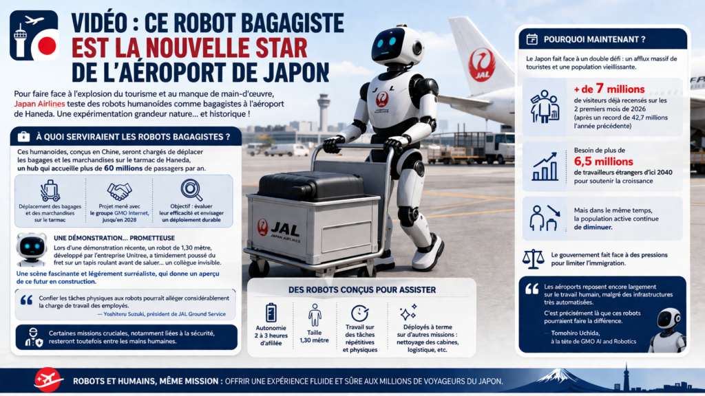 Dès le début du mois de mai, la compagnie lancera une phase d’expérimentation à l’aéroport de Haneda. Le but est de voir si ces robots peuvent, à terme, s’installer durablement pour soulager des équipes humaines débordées.