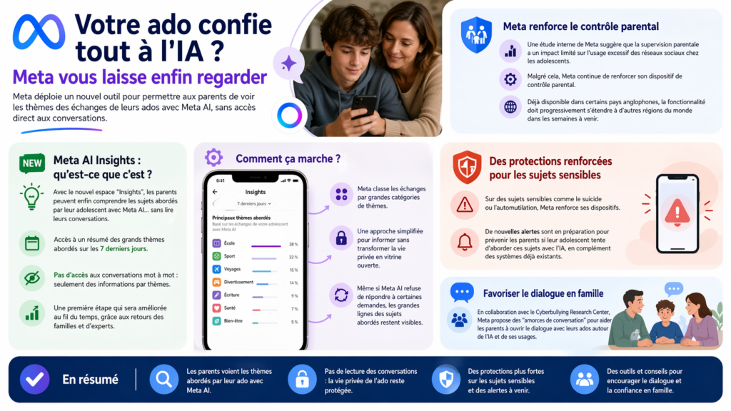 Les ados et les IA sont devenus de plus en plus intimes ces derniers temps. Alors, Meta a pris ses responsabilités. Désormais, les parents peuvent savoir ce que leurs ados racontent à Meta IA, sans jouer les détectives dans leurs téléphones. Ceci est possible grâce à un nouvel espace baptisé “Insights”.