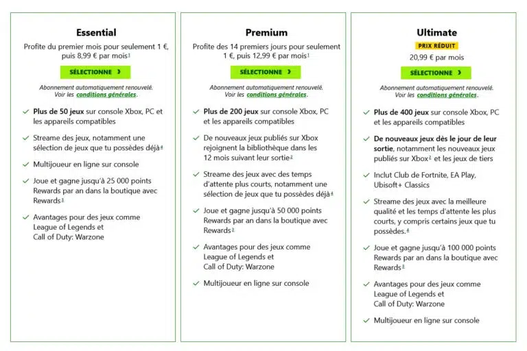 Les offres d’entrée restent stables. Xbox Game Pass Essential est toujours affiché à 8,99 euros par mois, tandis que le Premium reste à 12,99 euros. Mais les ajustements se font sentir sur les formules plus complètes.